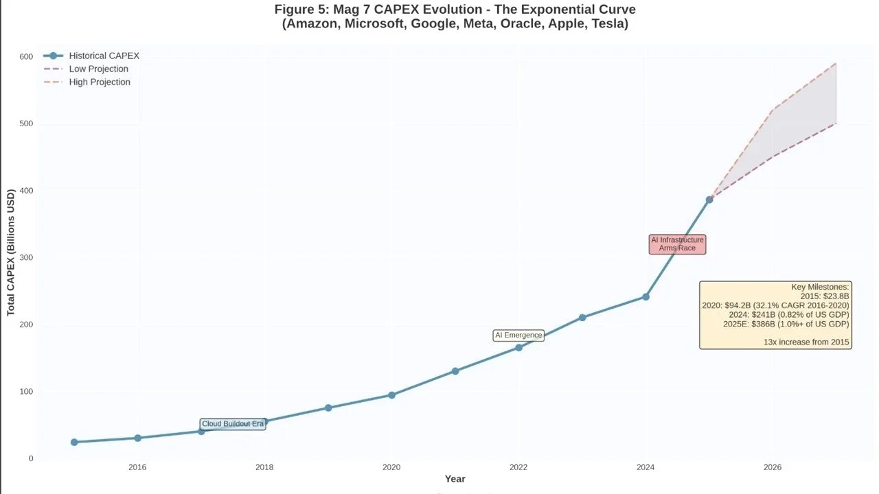 Comparatively, AI capex has now reached 1.28% of GDP (Q2 2025 annualized) for the Magnificent Seven companies—exceeding the peak of telecom capex as a percentage of GDP. However, the comparison requires examination of fundamental structural differences in how this buildout is being financed.